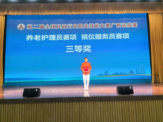 近日,第二届全国民政行业职业技能大赛广西选拔赛在南宁圆满落幕。市投控集团白云颐养中心护理员盘有玲代表柳州参赛,凭借过硬专业素养和稳定现场发挥,荣获养老护理员赛项三等奖。